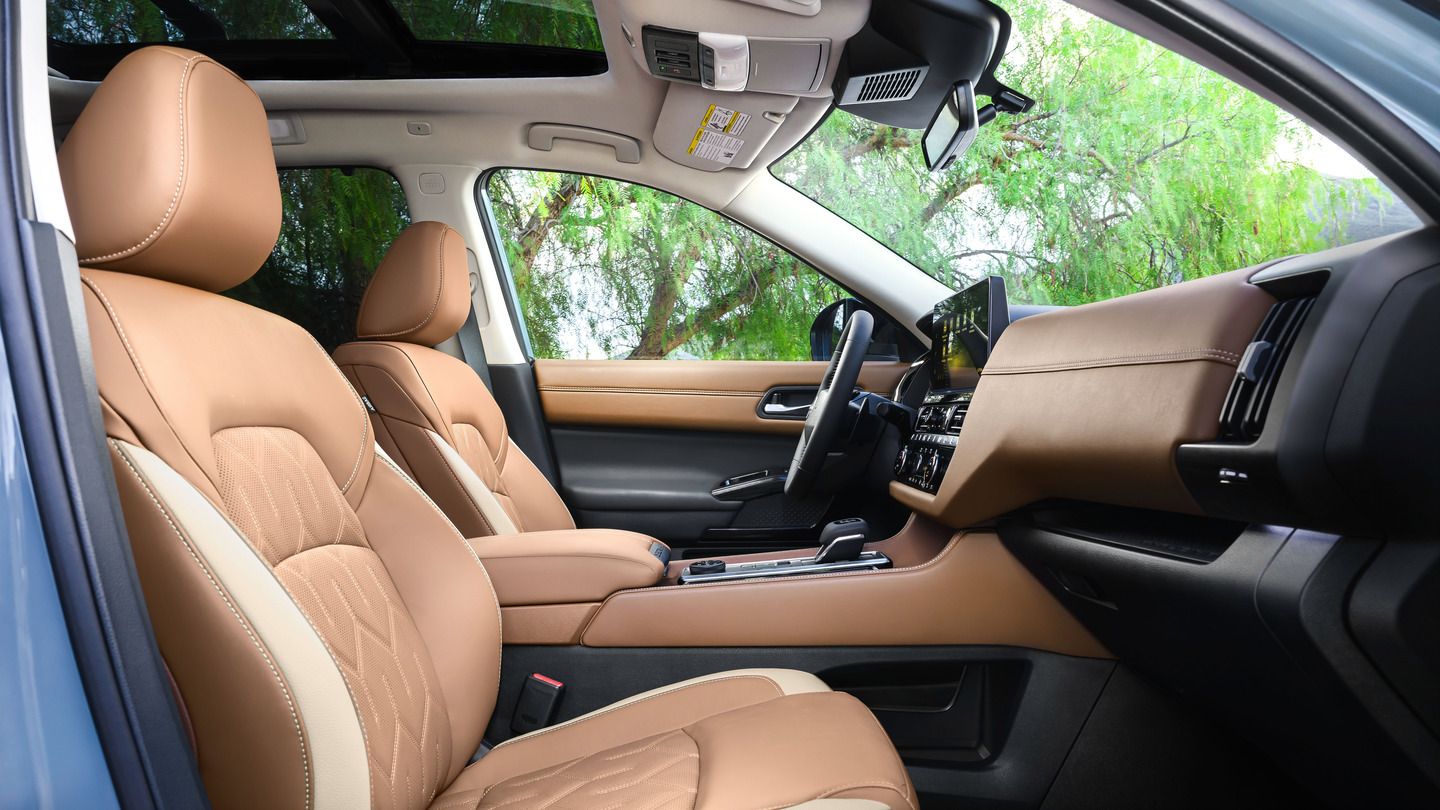 The Platinum grade features a new 20-inch wheel design that enhances the premium aesthetic. Inside, the dashboard has been restyled with embossed "PATHFINDER" lettering and new seat quilting patterns. Platinum models also gain wood-toned interior trim that enhances the cabin atmosphere.